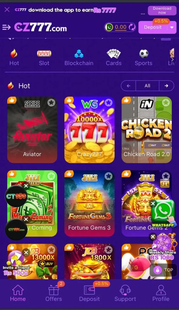 CZ777 Game is basically an online real-money-earning app where players enjoy various casino-style games and win actual cash. It includes popular options like slots, Aviator, Plinko, Dragon Tiger, and card games. Users from Pakistan find it perfect because it supports local payments.